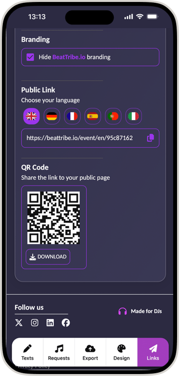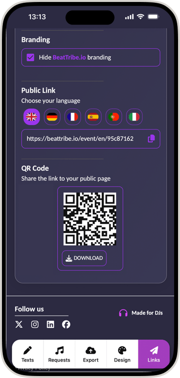Instant QR Code Sharing. Download your custom QR code for song requests. Display it on the DJ booth or guest tables. Guests suggest music instantly through their mobile browser—no app download needed.
