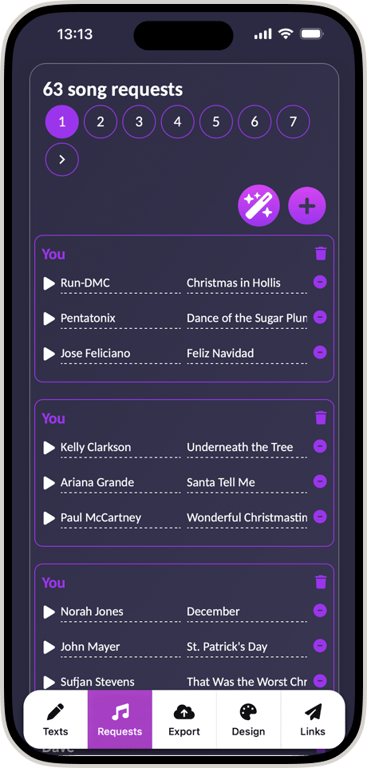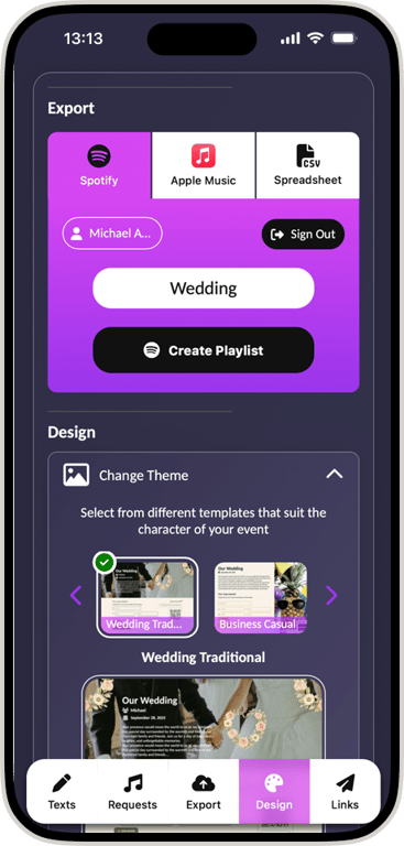 Export to Spotify & Apple Music. With one click, sync your requests to a native playlist for your DJ set or party stream.